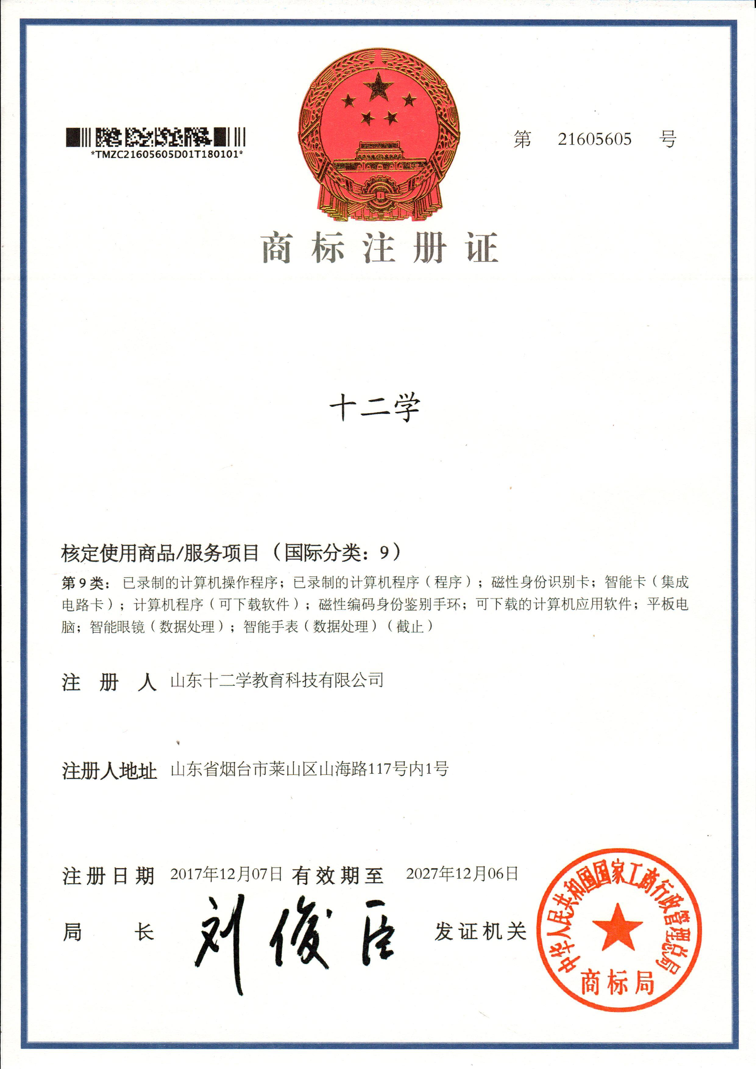 另外,“十二学”也已于去年成功获得中华人民共和国国家工商行政管理总局商标局核准注册!