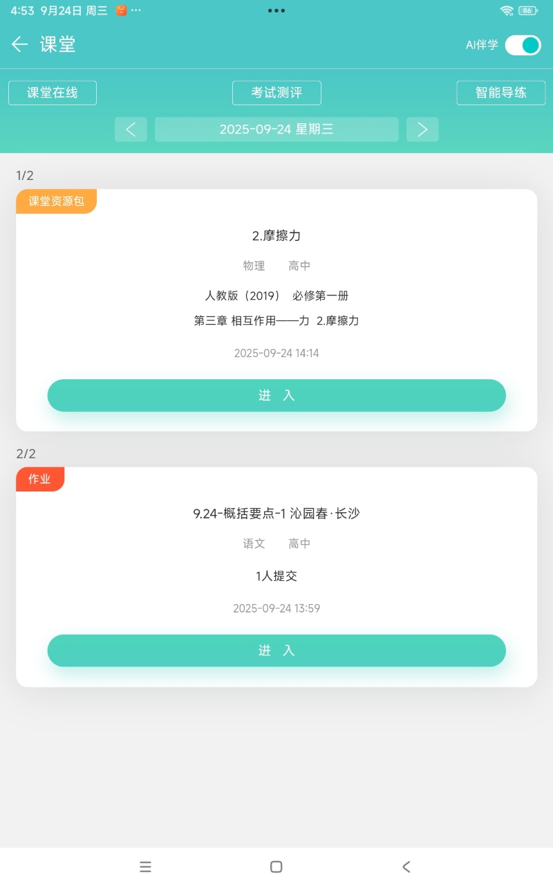 教师可通过 12xue教师端APP,根据课堂进度与教学需求自主控制AI伴学功能开关。